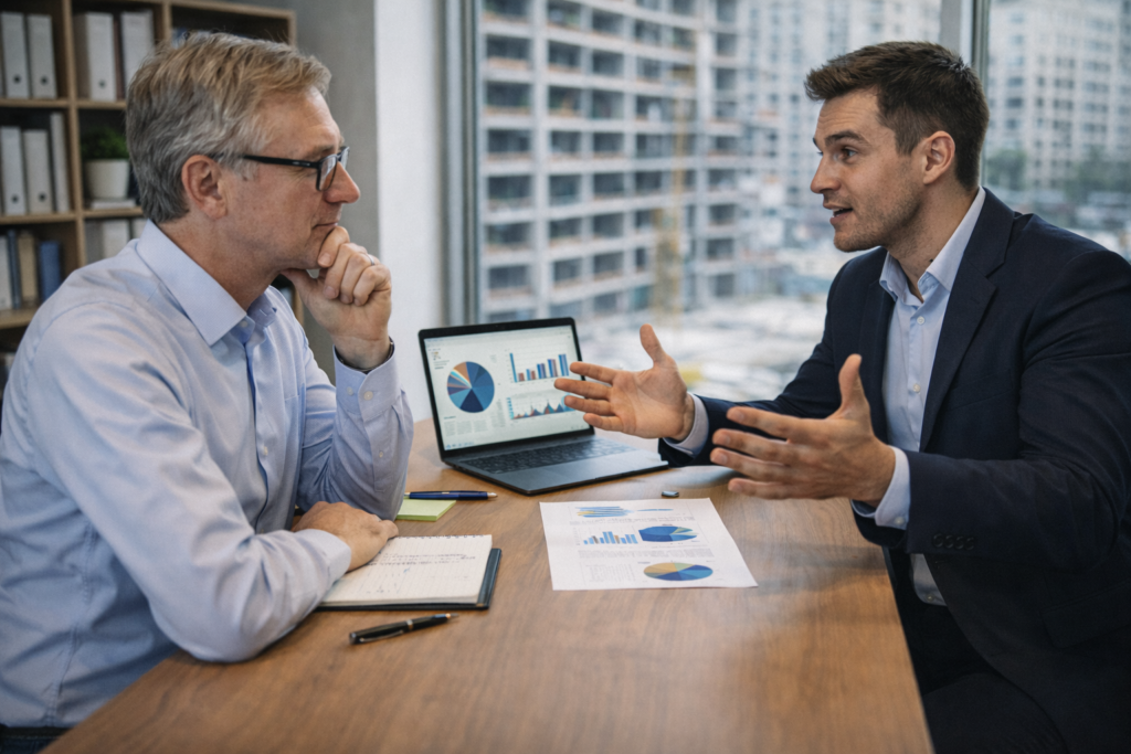 Ty w tym czasie, będziesz tropić brokerów gruntów, opracowywać oferty dla klientów, kontraktować architektów, sprzedawców nieruchomości i pilnować by sprzedaż wyprzedzała produkcję budowlaną, a nie odwrotnie.
